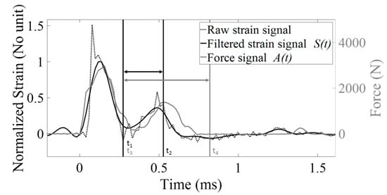 The time variation of the strain and force signals obtained with the strain hammer (corresponding to the averaged signal obtained with the three strain gauges) and with the force sensor during each impact was recorded using a data acquisition module (NI 9234, National Instrument, Austin, TX, USA) with a sampling frequency of 51.2 kHz and a resolution of 24 bits.