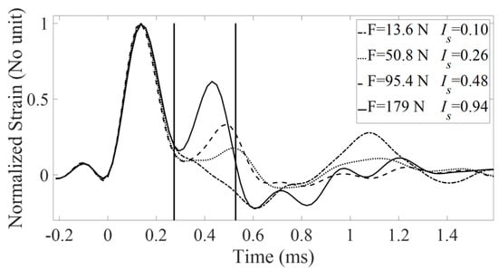 Figure 5 shows different normalized and filtered rf signals obtained with the strain hammer for various configurations corresponding to four different values of the AC implant stability. Figure 5 shows that the amplitude of the rf signal in the time window used for the determination of Is increases when the AC implant stability F increases.