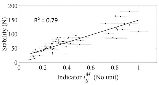 Figure 7 shows the variation of the AC implant stability F as a function of the average value of the indicator obtained with the force hammer for all data pooled. The standard deviation of indicators values are represented by the error bars. A linear regression between the averaged value of the indicator and the tangential stability F shows a significant correlation (R2 = 0.80, p-value < 0.001).