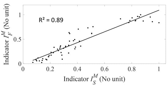 Figure 8 shows the relationship between the averaged values of and for all data pooled. A linear regression shows a significant correlation between and (R2 = 0.89, p-value < 0.001).