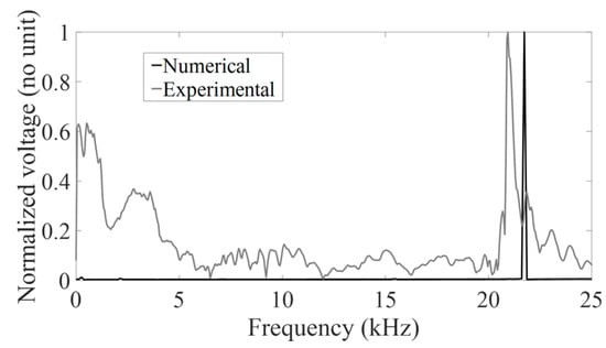 As shown in Figure 2, the strain sensors were attached to the lateral surface of the strain hammer. Therefore, the strain sensors are likely to be sensitive not only to the impacts, but also to the natural resonance frequency of the hammer itself. The grey line in Figure 10 shows the frequency spectrum of a typical rf signal s(t) where a resonance frequency is obtained around 21 kHz. In order to understand the physical determinant of this resonance frequency, a simple 3-D finite element model was developed in the frequency domain taking into account the geometry of the strain hammer using the COMSOL software (Comsol AB, Stockholm, Sweden). The multiphysical numerical code solves the elasto-dynamic equations for the hammer, while the sensors are modelled as piezoelectric materials. At these frequencies, the wavelength of electromagnetic waves is much larger than the thickness of the piezoelectric elements. Thus, a quasistatic assumption is used for the electric fields. The model has 49,272 tetrahedral quadratic elements, and it is solved for 222,241 degrees of freedom in the frequency domain. The black line in Figure 10 shows the frequency response of the hammer in terms of voltage measured at the electrodes, the solicitation being a Gaussian surface at the impact surface. This simulation does not take into account the real impact since the aim is to identify the modes of vibration of the hammer, as excited by a harmonic source. The resonance frequency obtained around 22 kHz corresponds to the free variation of the hammer head (data not shown), which does not carry any useful information on the impact. The difference between the experimental and numerical resonance frequency may be explained by the uncertainty on the exact geometry and material properties. In order to filter this resonance frequency, a low-pass Chebyshev filter with a cut-off frequency equal to 5.1 kHz was chosen. We verified (data not shown) that changing the value of the CF frequency between 4 kHz and 7 kHz did not affect significantly the results (less than 2% difference for R2).