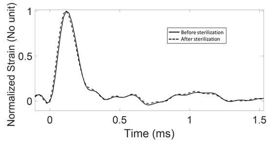 The first difference between the two hammers lies in their geometry. The force hammer has a protuberance due to the force sensor, which makes it difficult to use it in the clinic because the surgeon has to impact the ancillary on this protuberance, which is not easy and may disrupt the surgeon’s gesture. Conversely, the geometry of the strain hammer is similar to existing orthopedic hammers and the impacting face is flat and large enough. The second difference between the two hammers lies in the fact that the force sensor cannot be sterilized because the presence of electronic components inside the sensor, according to the specifications provided by the manufacturer. Meanwhile, the strain hammer can be sterilized because the piezoelectric gauges can handle up to 175 °C (Curie temperature equal to 350 °C), according to the manufacturer. Figure 11 shows two signals obtained with the same configuration and with the same strain hammer before and after an autoclave cycle (one hour with a maximum temperature of 134 °C and a maximum pressure of 0.21 MPa) leading to the sterilization of the hammer, similarly as what is done in the clinic. The results show that the two signals are almost identical, the difference being due to the reproducibility of the measurements.