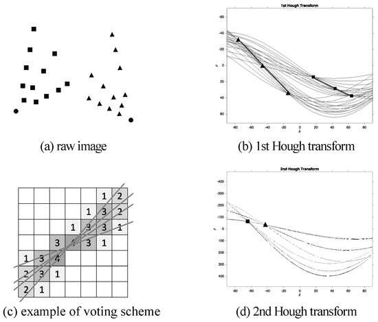 Figure 2b illustrates the result after the first Hough transformation, in which candidate peaks are marked as squares and triangles forming a line. An example of a voting scheme is shown in