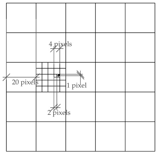 Figure 11b,c). This test case used a 10 × 10 coarse-to-fine fine-tuning moving pixel pyramid. The sampling spans were of 25, 10, 3, and 0.5 pixels, respectively for each level.