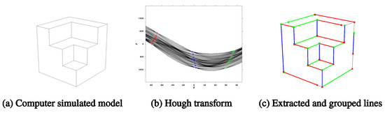 Figure 7a) was used to demonstrate the developed vanishing point estimation and refinement process step by step. The simulation image was generated using Trimble Sketch Up software. After creating the 3D model, it was output to an image with the perspective matrix projection camera module. Strong edge pixels were extracted from the raw image and converted into first Hough space for line detection. The high peaks in the first Hough transform were extracted with local maximum suppression, removing duplicated candidates due to over-segmentation. The extracted peaks represent the line equations in the image space. To clarify which lines belong to which vanishing point, the high peaks are further transformed in the second Hough space. The transformed peaks intersect at the same bin if they belong to the same vanishing point in the image space. The classified result (