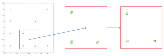 The error of each set of grouped projection point during the base points estimation process can be minimized by fine-tuning the positions of vanishing points. The vanishing point localization errors will cause the displacement during the projection process; therefore, the calibration results normally include systematic errors. Feature points with the same height and Y coordinate should be perfectly projected onto the same projection point as shown in