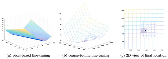 computational complexity. The fine-tuning begins with larger pixel spans to locate a coarse area with the lowest standard deviation value. Then, the span pixel value is reduced to zoom in to a smaller area, until the iteration ends with the sub-pixel leveled fine-tuning.
