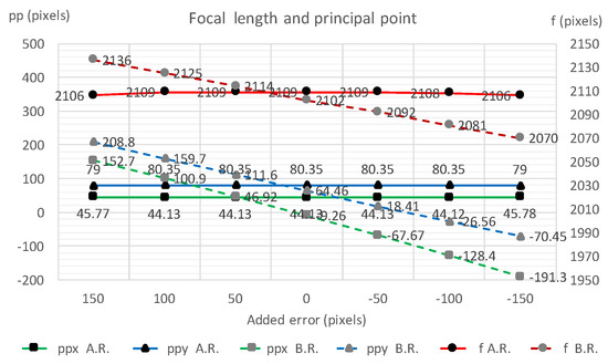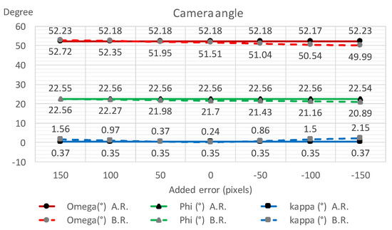 To validate the robustness of the proposed refinement process, IOPs and EOPs were calculated with several additional offset errors manually put on to the initial vanishing point