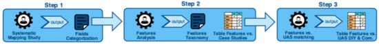 - Step 1. Systematic Mapping Study (SMS): A systematic mapping study is carried out in order to identify a collection of representative case studies and areas where UAS are being used.