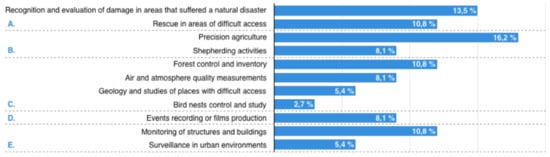 In order to identify the features that are required in UAS systems, we performed an SMS of the literature where we analyzed the application fields and case studies where UAS were being used. The case studies evaluated were extracted not only from the academic domain, but also from commercial and industrial applications. Moreover, most of the projects studied were related to areas considered as critical for society [,], e.g., security, agriculture or water management.