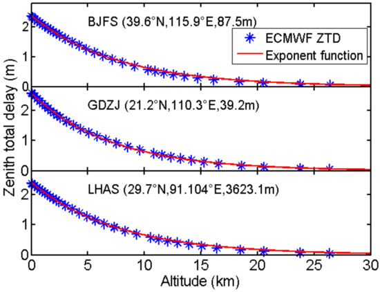 Figure 1 presents the vertical profiles of ZTD derived from ERA-Interim at the nearest grid points from station BJFS, GDZJ and LHAS. These three stations locate in different areas in China with significantly different latitudes and altitudes. The ZTD profiles show exponentially or near exponentially decreasing trends with altitudes.