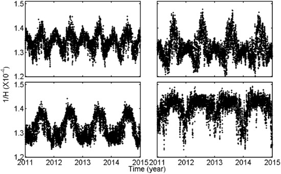 The 4-year (2011~2014) time series of parameter 1/H at the nearest grid points of four GPS stations.