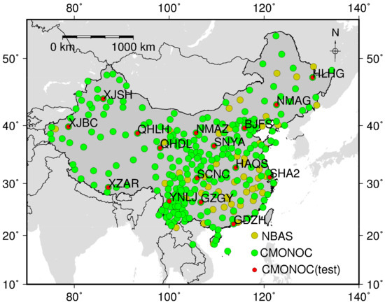 GPS Data at 260 CMONOC GPS stations (Figure 5) in four months (Jan., Apr., Jul. and Oct.) during year 2015 were processed, among which 16 stations were selected as test stations, and the other stations were taken as base stations for real-time ZTD grid product generation.