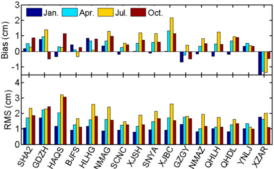 Taking post-processing ZTD as references, the bias and error RMS of ZTD calculated from real-time grid product at 16 test stations are summarized in Table 5. We can find smaller RMS of about 1.09 cm in winter (Jan.) with insignificant bias, but larger RMS of 2.07 cm in summer (Jul.) with bias of 0.66 cm. The bias and error RMS at each test station are presented in Figure 6. The largest bias (~2.2 cm) is found at station XJBC in summer, which may be due to the fact that station XJBC locates at the edge of the CMONOC network with sparse stations around. RMS in summer are usually larger than RMS in other seasons mainly due to larger variations of water vapor content in summer. Overall, according to Table 5 and Figure 6, the generated real-time ZTD grid product based on CMONOC can provide real-time ZTD with bias of 0.39 cm and RMS of 1.56 cm, and the accuracy is not significantly affected by the station altitude.