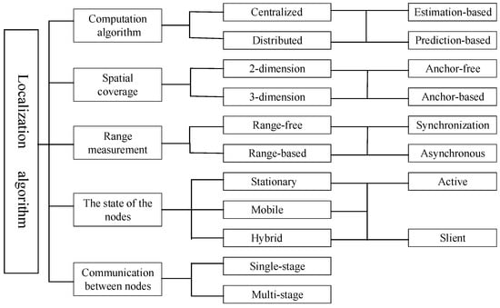 Localization has drawn a lot of attention from the researchers in UWSN research fields because the localization algorithms of WSN are not suitable for use in UWSNs directly. Hence, new methods or improved techniques must be put forward, and many research results have been reported. To make a better comparison of these papers, we classify them into five aspects, namely, computation algorithm, spatial coverage, range measurement, the state of the nodes and communication between nodes. We show the taxonomy figure in Figure 1. In the next section, we will introduce each part of the taxonomy in detail.