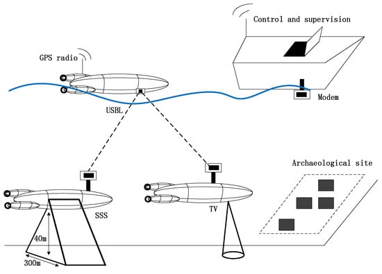 Firstly, we consider the estimation-based schemes. In [], the authors present the experimental results obtained with two techniques for navigating an AUV within an acoustic sensors network by using a mixed USBL/LBL system. The vehicle employs the USBL measurements first to localize the fixed nodes and then to perform autonomous navigation in the first technique. The second technique can estimate both the navigation of the vehicle and the topology of the network by using the acoustic measurements. Furthermore, the authors called this framework Acoustic based SLAM (A-SLAM). The vehicle, called Typhoon, is able to cooperate in swarms to perform navigation, exploration, and surveillance of underwater archaeological sites. As shown in Figure 2, three different underwater vehicles (vision explorer, acoustic explorer, and team coordinator) cooperate as a single team, and each vehicle of the team can be customized for different mission profiles; moreover, the team composition can be altered. The algorithms have been tested on experimental data collected during the CommsNet13 campaign, led by the NATO CMRE in September 2013, with the Typhoon vehicle. The results show that the algorithm can achieve the error bounded within values suitable for most of the applications even with a low-cost, low-accuracy INS and acoustic positioning information coming at irregularly spaced.