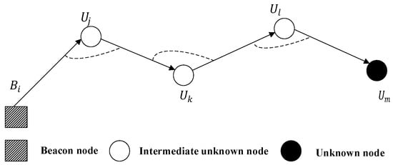 In [], the authors take isolated unknown nodes into account. Considering the mobile UWSNs, the nodes are mobile with the water currents. Hence, the nodes may be dispersed and cannot communicate with enough beacons. The authors propose a Multi-hop Fitting Localization Approach (MFLA) that sets the intermediate nodes between beacons and unknown nodes as routers to construct paths (shown in Figure 3) via a greedy method, then fitting the multi-hop path into straight lines and estimating the position of the node through trilateration. When hidden nodes cannot find three neighboring beacons, MFLA will be executed. Then, some intermediate nodes are employed to form a polygonal line from the hidden nodes to the nearest beacons subsequently. This polygonal line is fitted for trilateration localization.