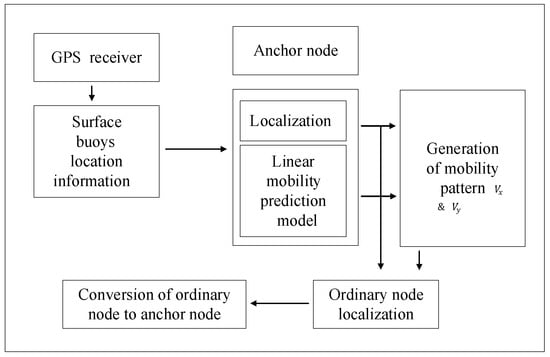 As for the prediction-based scheme, the authors in [] propose an Efficient Mobility Based Localization (EMBL) scheme. In this scheme, the prior known positioning information of the node is used to predict its future mobility pattern and obtain its position at the next time. The kinematic mobility model is employed in this scheme to represent the movement in UWSNs. The authors describe the particular algorithm in Figure 4. Anchor nodes with more energy can position themselves in each localization period, and they perform the complex mobility prediction algorithm. The localization of ordinary nodes contains the mobility prediction and location estimation. A Scalable Localization scheme with Mobility Prediction (SLMP) is presented in []. The localization process is similar with the EMBL.