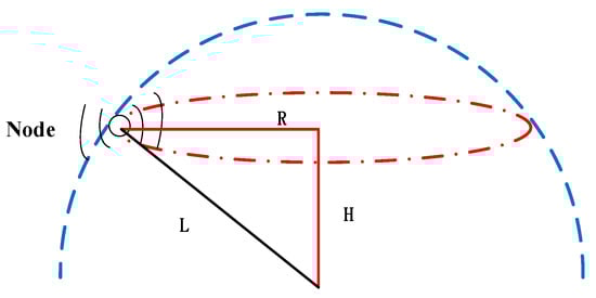 Similarly, 3D-networks are classified into two subcategories, namely, anchor-free and anchor-based schemes. Firstly, we introduce the anchor-free scheme. An Anchor-Free Localization Algorithm (AFLA) is presented in [], which is suitable for the active-restricted UWSNs. This algorithm takes advantage of the relationship of adjacent nodes and does not require an anchor node. In this scheme, the active-restricted nodes mean, when they anchor at the bottom of the sea, they can float in the sea and move within a hemisphere area (shown in Figure 5). The anchor and the cable length (denoted as L) is the center and radius of the hemisphere, respectively. Note that the pressure sensor can obtain the depth (H) of the node. The node with the unknown location broadcasts its spherical center’s coordinates, depth, and cable length. When two messages are received by the node, it calculates the position. In addition, the authors consider the various characteristics of the mobile network and describe the mobile node localization process in detail.