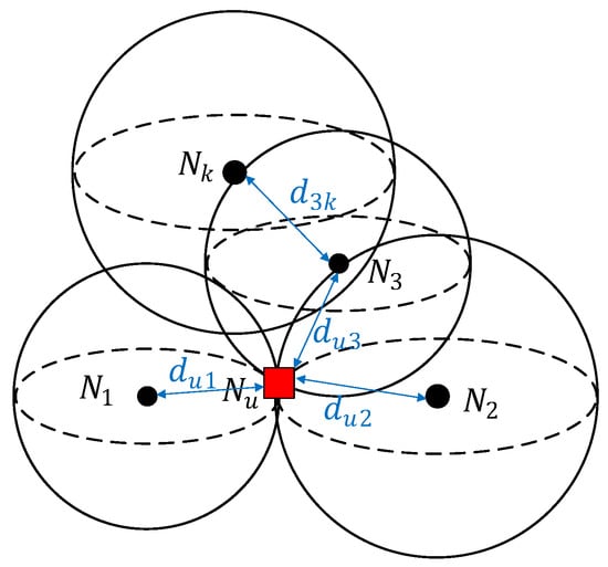As for the anchor-based scheme in 3D-UWSNs, a relatively larger amount papers will be introduced. In [], the authors analyze the problem existing in the nonlinear least-square-based node self-localization scheme, point out the biased distribution of multi-hop distance estimation error, and employ the orthogonal regression method to solve the problem of normal nodes localization in the case of error anchor position. The multi-hop localization framework is shown in Figure 6. The normal node and anchor node can be denoted as and , and their coordinates are and ,respectively, where , and K is the anchor node number. can obtain all multihop distance estimations to the anchor nodes by multihop information exchange. The problem of locating the node can be shown as the following nonlinear regression model: