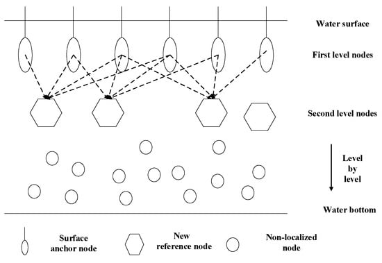 In [], a Top-down Positioning Scheme (TPS) that is suitable for UWSNs increases the localization coverage while keeping the localization error small. The node deployment of this scheme is shown in Figure 7. Firstly, only the ordinary nodes close to the surface anchors can obtain the location information, and they calculate the confidence values and compare with the threshold of confidence. They become the new reference nodes only when the confidence values of the nodes are larger than the confidence threshold. The localization algorithm is the gradient method and a scheme that can estimate two-hop Euclidean distance in 3D space is proposed to help the non-localized node find enough reference node to realize localization.