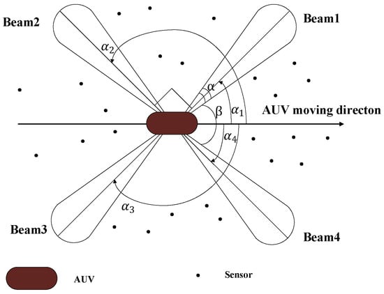 System architecture contains sensor nodes and a mobile AUV equipped with four directional beams [,].