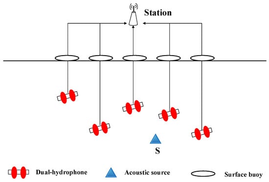 System overview. A 3D-UASN formed by randomly deployed dual-hydrophone nodes, which can be used to locate the acoustic source. Each node floats with a buoy [].