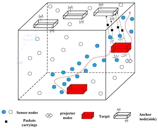 In [], the authors propose a 3D underwater target tracking (3DUT) scheme to collaboratively complete the underwater target accurate tracking with the least energy consumption synergy. The scheme is based on the TOA algorithm and using the trilateration to obtain the positioning information of the target. Making the most of the positioning information and the calculated velocity of the target, and employing a new target-movement-based duty-cycle mechanism, can achieve the energy-effective target tracking. Due to the continuous surveillance, the energy resources of boundary nodes may deplete rapidly. Considering the problem, the authors employ an adaptive procedure to find, designate, and activate new boundary nodes. The network model is shown in Figure 10. In this scheme, at least three anchor nodes are required. Hence, the sink gathers the information and performs the calculations. The sensor nodes collect and send data to the sink. The projector node may change during the tracking process.