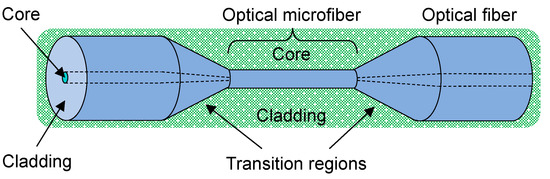Optical fibers are commonly made of fused silica, with dopants allowing precise tailoring of refractive index (RI). A typical OM shown in Figure 1 is the uniform waist of a biconical optical fiber taper, with a diameter similar to the wavelength of light in free space. Light is guided along the core of the standard optical fiber until the taper transition. Then, the original core diffuses and the cladding becomes the new core, with the external medium being the new cladding. At the second taper transition, the guidance reverts back to the original conditions.