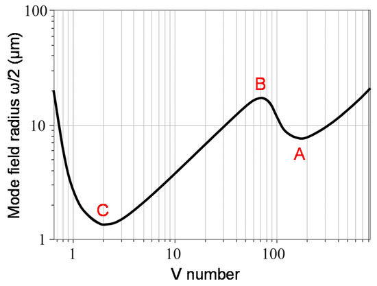 Mode confinement during mode guidance can allow low-loss propagation inside the core of the OM, which can be expressed in terms of the mode-field diameter (ω) that is a function of the V-number [5]. By tapering a regular-sized optical fiber according to Figure 4, the confinement drastically changes. Initially, the light is guided by the core-cladding interface. When the OM radius (r) starts to decrease, the V-number decreases and the light becomes more tightly confined within the core, until ω drops to a local minimum point (A). For smaller V-numbers, the light leaks into the cladding. The new guidance by the cladding-surrounding interface causes ω to hit a local maximum (B). By further reducing the V-number, the light is confined tighter within the cladding, until ω reaches the minimum point (i.e., single mode) at V = ~2 (C). The region below V < 2 is typical of OMs, where ω can be much greater than r, and a large portion of the total power resides within the cladding. For V < 0.6, ω can continue to expand until it becomes orders of magnitude larger than r.