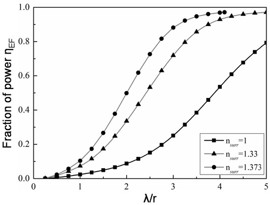 Dependence of the power fraction propagating in the evanescent field on the wavelength-to-radius ratio in different refractive index surroundings [5].