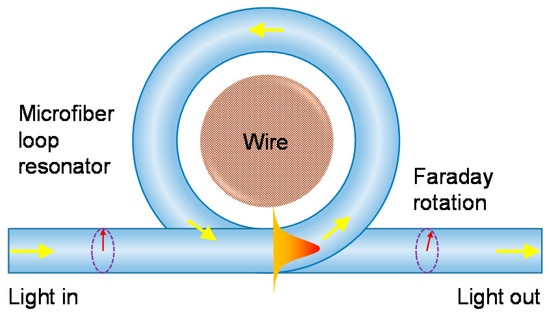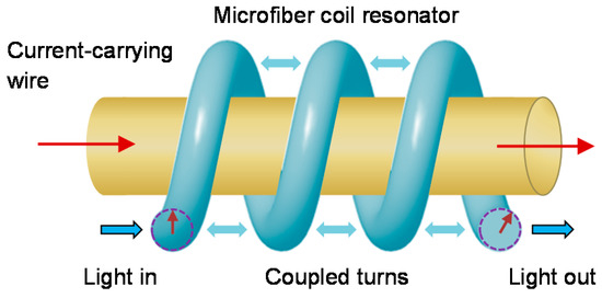 Current sensors are widely used to detect transient electrical faults and partial discharges on DC lines, in order to protect high power equipment and components. Fiber-optic current sensors that exploit the Faraday effect [18] have attracted interest due to their resilience to electromagnetic interference (EMI) and wide dynamic range. The simplest alternative sensing mechanism is thermal effects, which has been demonstrated with a microfiber knot resonator by Guo et al. [19], a MCR by Belal et al. [20], bend inline OM interferometer by Jasim et al. [21], and graphene-oxide-MC by Yan et al. [22]. They have the benefit of simplicity, being resonance and interferometry based, but are unstable and lack the dynamic range, detection bandwidth and response time achievable with the Faraday effect. Other sensing mechanisms include magneto-optic fluid by Li et al. [23], which is temperature insensitive but can be affected by stray magnetic fields. In addition, strain-based current sensing by Yan et al. [24], which is simple but temperature dependent. The Faraday effect describes a current-induced magnetic field aligned parallel to the direction of light propagation, inducing a rotation in the polarization of light. Optical fibers can allow the direction of light propagation to be aligned with that the magnetic field. A popular design consists of an optical fiber coiled around a straight current-carrying wire rather than a conducting wire wound around a straight optical fiber, as shown in Figure 6. Not only is this arrangement more viable in a real measurement environment, it also minimizes the load impedance and thermal effects along the current-carrying wire. As a result, the frequency of alternating current (AC) signals can exceed hundreds of kilohertz that is typical of the coiled wire arrangement. Moreover, it has lower cross-sensitivities than those of the straight-fiber configuration, which are ideal for the measurement of 1-dimensional magnetic signals in 3-dimensional space. Conventional fiber-optic current sensors are relatively bulky [25,26], because of the large bend radius required to maintain sufficiently low optical-loss. Moreover, the relatively low Verdet constant of silica necessitates a large number of fiber turns to produce a measurable Faraday rotation. Owing to their long optical path lengths (OPLs), the transit times of light (i.e., integration times) are long, and as a result their detection bandwidths cannot exceed tens of megahertz. Overcoming this hurdle will open the doors to applications in portable electronic devices and defence (e.g., electromagnetic pulse).