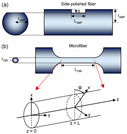 Side view of (a) a side-polished fiber, and (b) the waist of a tapered fiber. Expanded: Schematic diagram of the spun microfiber with a constant spin rate Ф along fiber axis z. Typically rSMF = 62.5 μm, rOM is between 1 μm and 10 μm, L is between 0.1 μm and 1 m, and Ф is between 0 and 100 π/cm.