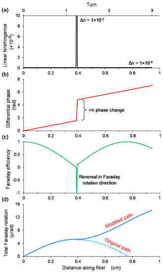 One conceptual approach to this problem was developed by Chen et al. [42], who demonstrated that by manipulating the local birefringence at certain regions along the OM indicated in Figure 12, a gain of ±π in differential phase between the polarized light in the two orthogonal axes of the birefringent OM can prevent the sensor head from entering a state of reversal in Faraday rotation, by jumping to a state that continues with the same direction of Faraday rotation. This approach is predicted to be highly flexible and tolerant to MC fabrication imperfections and post-fabrication linear-birefringence treatment errors. The procedure involves measuring the PBL of a fabricated MC sample, before modifying the local birefringence at initially a quarter of the PBL, then at every interval equaling a half of the PBL. The birefringence change could possibly be performed by femtosecond-laser inscription, though this is yet to be demonstrated. The precision of the localized modification in terms of the fiber position and modification area does not need to be high, as long as the perturbation in differential phase can prolong a unidirectional Faraday rotation. Furthermore, the results of this post-fabrication treatment could be monitored in real-time.