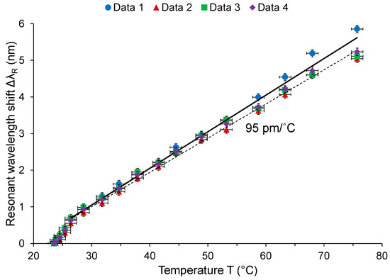 A 2.5-turn MCR of 2 μm core diameter and 15 mm uncoiled length was wrapped around a 1.8 mm diameter Teflon tube with a Nichrome wire passing through. The sensitivity was determined as 95 pm/°C between 26 °C and 76 °C, as shown in Figure 14. A detection limit of 0.21 °C was deduced.