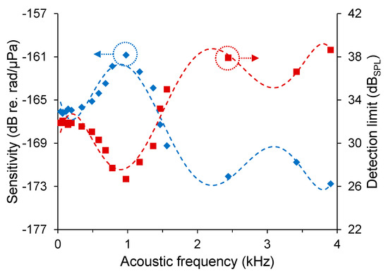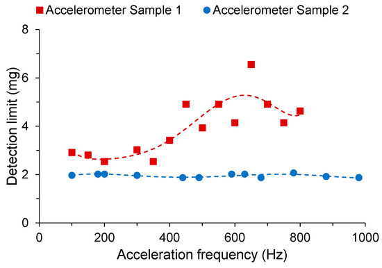 Two different accelerometer samples were compared. Sample 1 used a shorter OM of 10 mm length with a smaller diameter of 2 μm. Sample 2 used a longer OM of 60 mm length with a larger diameter of 10 μm to improve handling during the winding process due to the fragility of OMs. The samples were embedded in low-RI UV-curable polymer on a pyrolytic graphite disc of 25 mm diameter and 0.5 mm thickness. The average sensitivity is 2.0 rad/g for Sample 1, and 4.0 rad/g for Sample 2 at a signal frequency of 500 Hz, as shown in Figure 16. The average detection limits were observed to be 3.9 mg and 2.0 mg respectively. It is to be noted that this is a proof-of-concept demonstration, and to be competitive with commercial accelerometers, both optical and electrical, require the flexural disc to be packed with far longer OM.