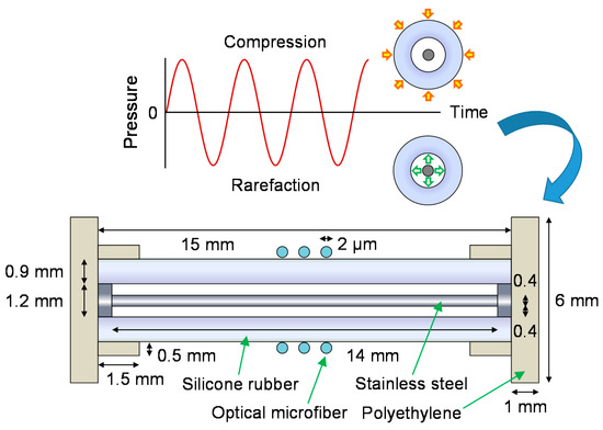 - Chen, G.Y.; Brambilla, G.; Newson, T.P. Compact acoustic sensor based on air-backed mandrel coiled with optical microfiber. Opt. Lett. 2012, 37, 4720–4722. [Google Scholar] [CrossRef] [PubMed]