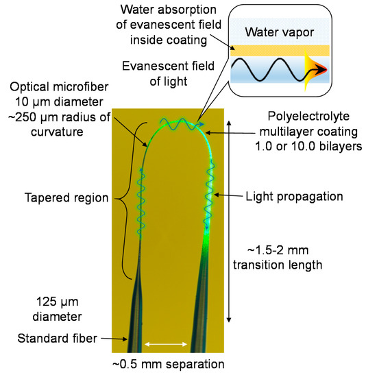 - Chen, G.Y.; Wu, X.; Kang, Y.Q.; Yu, L.; Monro, T.M.; Lancaster, D.G.; Liu, X.; Xu, H. Ultra-fast hygrometer based on U-shaped optical microfiber with nanoporous polyelectrolyte coating. Sci. Rep. 2017, 7, 7943. [Google Scholar] [CrossRef] [PubMed]