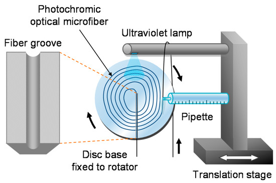 OMs can be manipulated into coils, loops, knots and other geometries [11,12,13] to increase sensitivity (e.g., alignment of light propagation direction with magnetic field) and reduce physical size (e.g., denser packing). For example, microfiber coil resonators (MCRs) involve coiling an OM onto itself to allow evanescent overlap and coupling of the guided mode in the adjacent turns. These micro-resonators can attain high Q-factors [13] that enhance the optical response to a measurand via the recirculation of light within a compact cavity. Figure 3 shows a coiling rig to perform the coiling process after the OM is fabricated, before the MCR is embedded in polymer resin which acts as robust packaging.