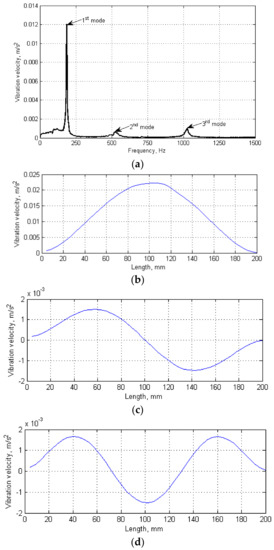 The testing procedure consisted of two steps. After clamping a tested specimen in holders and sticking the reflective tape on its surface to ensure appropriate reflectivity of a laser beam of a scanning LDV, the modal analysis was performed. The second LDV was oriented and focused on the upper surface of the smaller holder connected with a shaker to acquire the reference signal. The modal analysis was performed in the frequency range of 0–1500 Hz with a frequency resolution of 1.5625 Hz by excitation a tested specimen with a pseudo-random signal to acquire the wide-band frequency response. The number of scanning points during the modal analysis was set to 45 with 5 averaging cycles to ensure high accuracy of estimated natural frequencies. As a result of the modal analysis, the frequency response function (FRF) was obtained (Figure 2a). From FRF, the resonance peaks were selected, and the corresponding natural frequencies and modal shapes (Figure 2b–d) were acquired.
