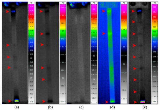 The specimens used for tests were manufactured from 14-layered epoxy-based composites reinforced by unidirectional E-glass fabric purchased from Izo-Erg S.A. (Gliwice, Poland). The dimensions of specimens were as follows: width of 10 mm, thickness of 2.5 mm, and length of 250 mm (note that the effective length, i.e., the length of the part of a specimen not clamped in the holders, was of 200 mm). To analyze the effectiveness of the proposed approach in damage identification, 9 equidistant notches with a depth of ca. 0.5 mm and distances between them of 25 mm were introduced on the specimens’ top surface. Additionally, to ensure appropriate thermal emissivity, the specimens were covered with a silicone black matt heat-resisting enamel.