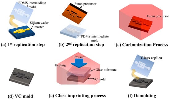 Proposed fabrication method for the glass microfluidic device. PDMS is poly-dimethylsiloxane; VC is vitreous carbon.