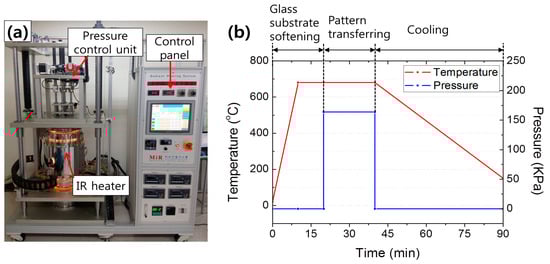 (a) Photograph of the glass imprinting system and (b) the temperature and pressure conditions during the glass imprinting process.