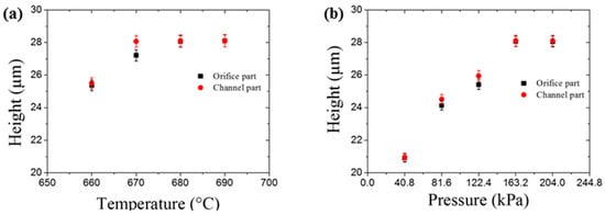 To obtain the optimum imprinting condition, the effects of imprinting (a) temperature and (b) pressure on the height of microchannel at the orifice and channel regions were analyzed as shown in Figure 3. It clearly shows that the heights of the imprinted glass microchannels increased as the temperature and pressure increased, and that the measured heights reached appropriate values when the temperature was higher than 680 °C and the pressure was higher than 163.2 kPa. Therefore, we selected an imprinting temperature of 680 °C and a maximum imprinting pressure of 163.2 kPa as the optimal conditions.