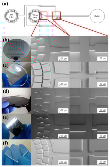 (a) Design of the droplet-generating microfluidic chip, and photograph and SEM images of the replicated glass microfluidic structure: (b) the silicon master, (c) the PDMS mold, (d) the furan precursor, (e) the vitreous carbon stamp, and (f) the replicated glass microfluidic structure.