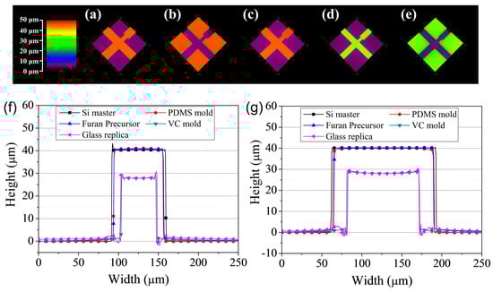 To verify the fidelity of the glass imprinting process, the samples were measured at each step. That is, (a) the silicon master, (b) the intermediate PDMS mold, (c) the furan replica, (d) the VC stamp, and (e) the replicated glass microfluidic structure were each measured. Figure 4 shows photographs and scanning electron microscopy (SEM) images of samples from each step. For quantitative evaluation, measurements were taken using a confocal microscope (OLS-4000, Olympus Co., Tokyo, Japan). Figure 5a–e show the 3D surface profiles of (a) the silicon master, (b) the PDMS mold, (c) the furan precursor, (d) the VC stamp and (e) the replicated glass microfluidic structure obtained by the confocal microscope measurement results. Figure 5f–g show the comparison of the surface profiles measured at (f) the channel and (g) the orifice. As shown in Figure 5f–g, the difference between the surface morphologies of the silicon master and Furan replica is negligible. However, considerable shrinkage occurred during the carbonization process. To analyze the shrinkage characteristic and repeatability of the proposed glass imprinting process with a VC mold, the geometrical properties of three PMDS molds, Furan precursors, and VC molds fabricated from a single silicon master, as well as 9 glass replicas from the three fabricated VC molds, were analyzed as summarized in Table 1. The total shrinkage ratios of the VC were 30.43% for orifice width, 30.17% for channel width, and 30.33% for height. It is clear that the almost isotropic shrinkage occurred in the VC mold fabrication process. The percent coefficient of variance of measured values in the VC mold were less than 1%. This means that the repeatability error of the proposed VC mold fabrication is under 1%, which is acceptable accuracy in microchannel applications. The dimensional difference between the VC molds and glass replicas was negligible because of the similar thermal expansion ratio of VC and glass materials. In addition, the surface roughness of the VC mold must be assessed to determine that it would be acceptable in microfluidic applications. Table 2 shows the channel wall surface roughness as measured in each step. Five different positions were measured on each sample, and the results were averaged. The results show that the deterioration of the surface roughness during VC mold fabrication and the glass imprinting process was negligible.