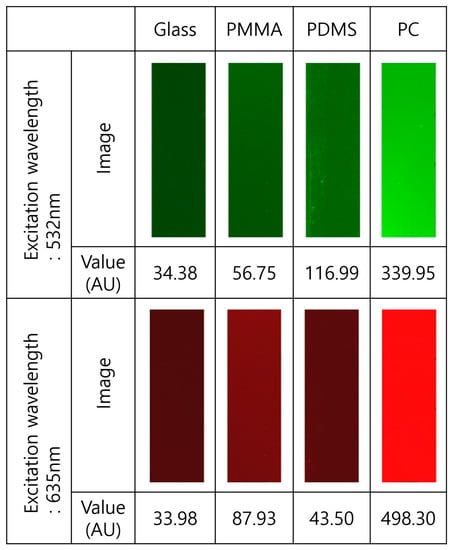 Finally, the initial autofluorescence of the fabricated micro channel structure was measured for two different excitation wavelengths: 532 nm and 635 nm. Those were compared with results from other commonly used materials for microfluidics, including PDMS, Poly(methyl methacrylate) (PMMA) and polycarbonate (PC). Laser-induced fluorescence detection was applied to measure the initial autofluorescence of the microfluidic chips. As shown in Figure 6, the fabricated glass microfluidic device has low initial autofluorescence level. We believe that this glass microfluidics fabrication method could be a powerful solution for the devices used in applications requiring sensitive fluorescence detection at low cost.