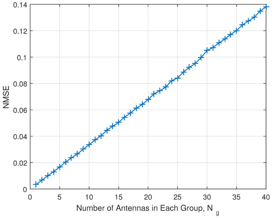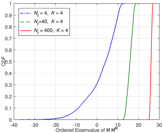 Note that, to get the benefit of channel hardening effect, usually the massive MIMO antenna systems should satisfy the condition of [26,27]. There is no strict criterion to get the channel hardening effect, but we can asymptotically observe the effect when is larger than .