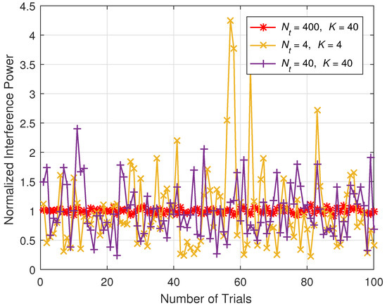Normalized Interference Power versus Number of Trials: As increases, the interference level converges to a certain point that can be easily estimated.