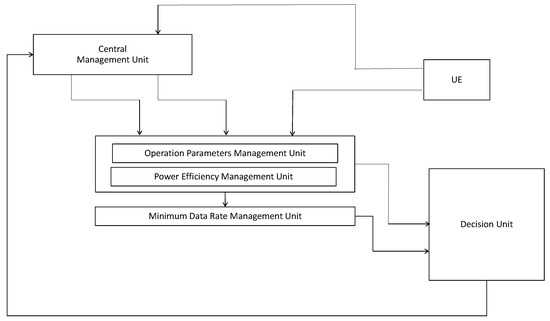 - We provide the system block diagram and algorithmic steps to apply the proposed determination scheme. The system block diagram is consisted of 5 main blocks, The central management unit, operation parameters unit, minimum data rate unit, decision unit, and UE. There are 3 thresholds we should consider for the systematic operation, i.e., power consumption, data rate, and the number of iterations.